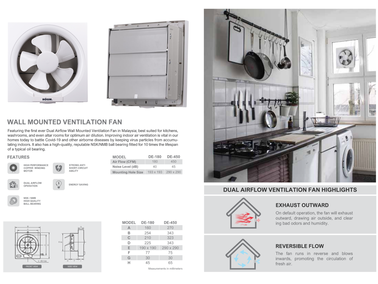 With its dual-flow functionality, the DE-450 not only removes stale air and contaminants with forceful efficiency but also replenishes the environment with a stream of clean, fresh air. This unique balance makes it far more than a conventional exhaust fan — it is a complete air exchange solution, capable of transforming large, enclosed interiors into healthier, more comfortable, and productivity-driven spaces.
