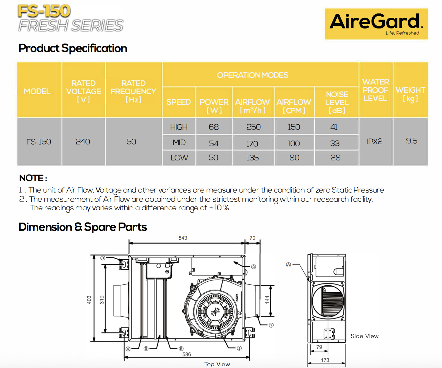 Operating on a turbine fan, the FS-150 offers triple-speed airflow to suit varying ventilation needs—reaching up to 150 CFM at peak mode, while maintaining exceptionally low noise levels for each setting, ensuring that comfort is never compromised by disruption. The intelligent design quietly adapts to your environment, delivering fresh, breathable air tailored to your comfort.